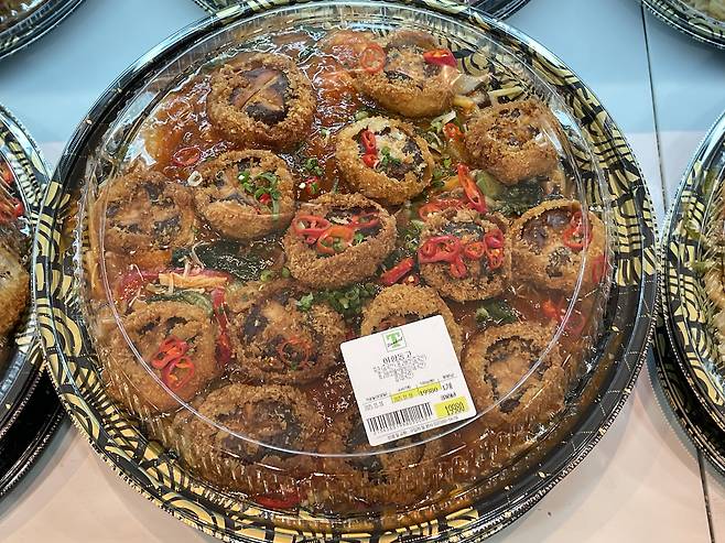 새우, 오징어 등 해산물을 채워 넣은 표고버섯 튀김에 어향 소스를 곁들인 중화요리에요.