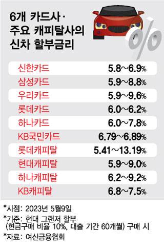 카드사별로 보면 신한카드가 연 5.8~6.9%로 가장 낮은 금리를 제공 중이다. 삼성카드는 연 5.9~8.8%, 우리카드는 연 5.9~9.6% 금리로 신차 할부를 지원한다. 롯데카드와 하나카드의 금리는 각각 연 6.0~6.2%, 6.0~7.8%다. KB국민카드의 금리는 연 6.79~6.89%로, 최저·최고금리 모두 6%대에 머무른다.