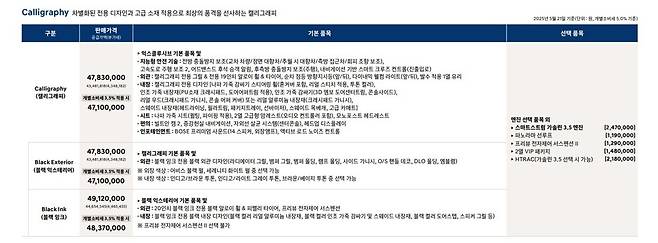 가솔린 2.5 모델의 판매 가격은 프리미엄 3,798만원, 익스클루시브 4,287만원, 아너스 4,513만원, 캘리그래피 4,710만원으로, 새롭게 추가된 아너스 트림을 제외하고 각각 87만원, 94만원, 61만원이 인상됐다.