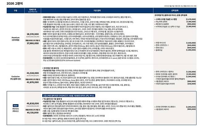 2026 그랜저는 기존 모델 대비 고객 편의성이 대폭 강화된 것이 특징이다. 특히 다수의 고객이 선택했던 고급 사양을 기본으로 구성한 스페셜 트림 '아너스'를 추가해 고급감과 실용성을 동시에 만족시킬 수 있도록 했다.