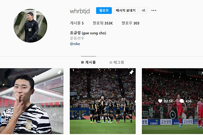 조규성은 인스타그램 팔로워는 25일(한국시간) 오후 3시 현재 35만 명을 넘어섰다. 기존 팔로워 4만여 명에서 8배나 급증한 것이다.