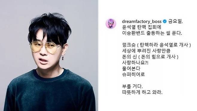 한편 이승환은 13일 서울 영등포구 국회의사당 앞에서 개최된 윤석열 탄핵 촛불 문화제에 출연했습니다.