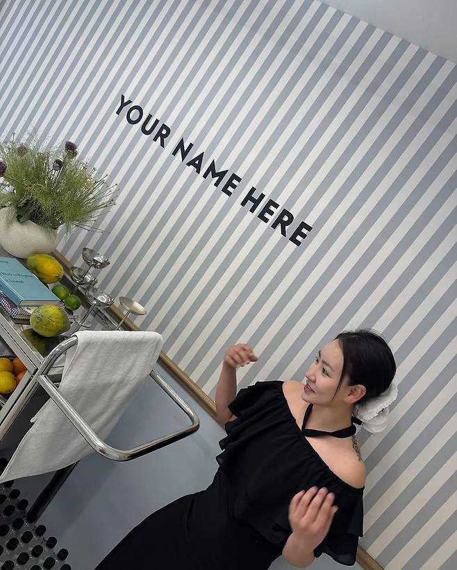 사진 속 공간은 ‘YOUR NAME HERE’라는 슬로건이 새겨진 스트라이프 벽면과 간단한 바 형태의 테이블, 컬러감 있는 과일과 소품들이 놓여 있어 조현아의 올블랙 패션을 더욱 돋보이게 만든다. 오렌지, 라임, 책 등으로 스타일링된 테이블은 일상적인 무드를 연출하면서도 인스타그래머블한 요소를 더한다.