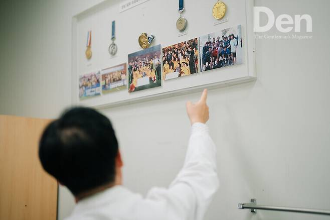양기원 교수는 2003년부터 2013년까지 성남 일화 천마(현재 성남 FC) 주치의로 근무했다. 사진은 2010년 AFC 챔피언스리그 우승 당시. 당시 팀을 이끈 신태용 감독과 더불어 축구계 주요 감독들의 젊은 시절 모습이 담겨 있다. 주치의 시절 사진을 보여주는 양기원 교수의 표정이 그 어느 때보다 밝다.