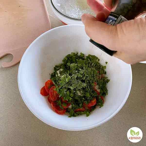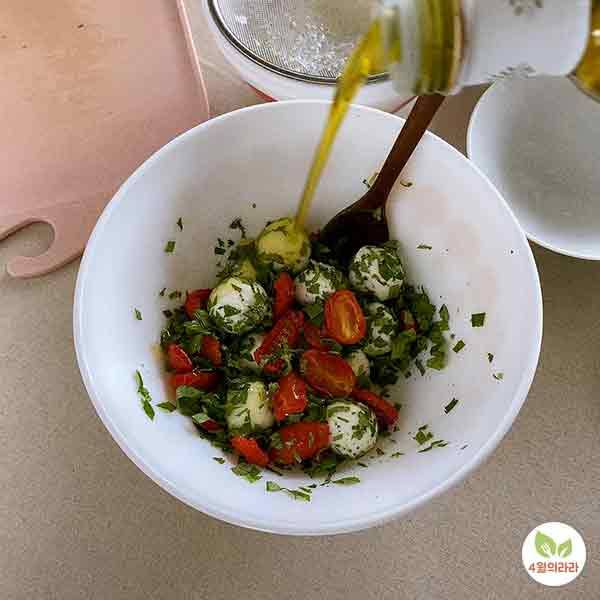→ 생모짜렐라치즈, 토마토, 참나물에 소금·후추·허브시즈닝을 뿌려준다.