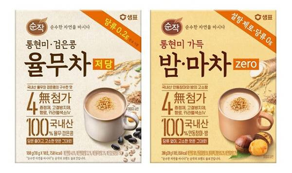 샘표는 알룰로스로 단맛을 더한 ‘순작 통현미 검은콩 율무차 저당(5,480원)’과 ‘순작 통현미 가득 밤 마차 제로(5,980원)’를 출시했다. 순작 율무차 저당은 국내산 율무와 검은콩, 현미, 쌀 등을 각 원물 특성에 맞춰 로스팅하고 물에 잘 녹도록 더 곱게 만들어 재료 본연의 구수한 풍미를 한층 부드럽게 즐길 수 있다. 당류 함량은 한 포 기준 0.2g이다. 순작 밤 마차 제로는 당류 0g인 제품으로, 안동 참마를 사용했으며 밤과 구운 통현미를 더했다.