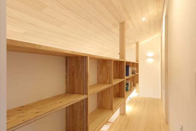 2층 복도는 난간 대신 선반을 두어 또 하나의 수납 공간을 만든다. 길게 이어진 선반은 아이 장난감부터 계절 용품까지 모두 수납할 수 있다.
