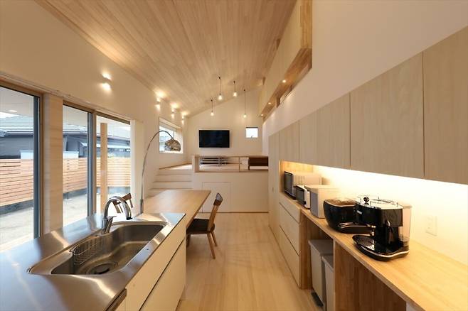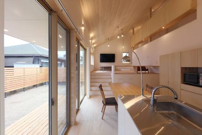 집의 중심은 남향으로 넓게 펼쳐진 정원과 연결된 LDK(Living, Dining, Kitchen) 공간이다. 거실, 식당, 주방이 연결된 이곳은 ‘활동적인’ 내부 공간이다.
