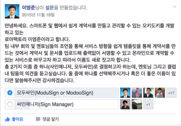 변호사 검색 서비스, 계약서 작성 서비스에 이어 2015년 11월 전자 계약 서비스로의 피봇(회사의 비즈니스 모델이나 사업 성격·방향을 바꾸는 것)을 결정했다. 사명도 변화가 필요했다. “당시 즐겨 사용하던 SNS에 설문을 올렸어요. 후보는 ‘모두싸인’과 ‘싸인매니저’였는데요. 압도적인 표차로 ‘모두싸인’이 새로운 사명으로 결정됐죠.”