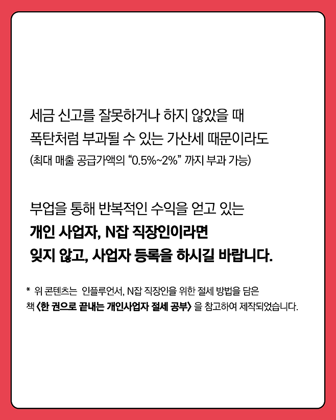 * 이 콘텐츠는 N잡러를 꿈꾸는 직장인, 1인 사장님을 위한 맞춤 세금 가이드북