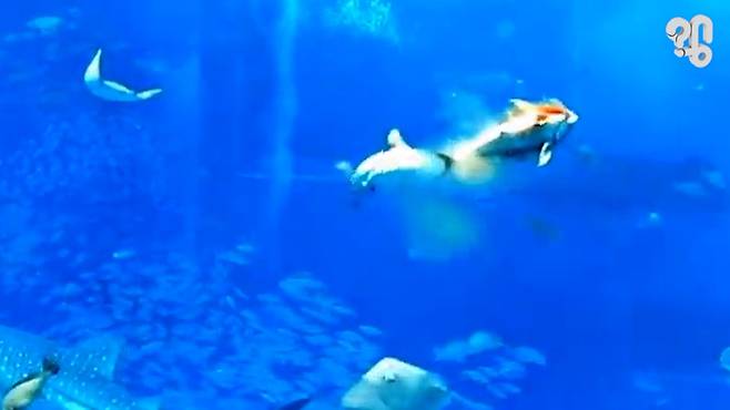 영상에 등장하는 아쿠아리움은 일본 최대 규모의 ‘추라우미 수족관’, 돌진해 죽은 물고기는 참다랑어류인 참치로 밝혀졌다.