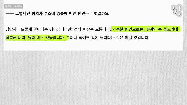 다만 이 경우엔 함께 수족관에 있던 다른 물고기들과 달리 유독 참치만이 돌발 행동을 보인 것에 대한 설득력은 다소 떨어진다.