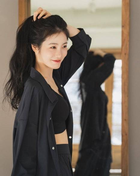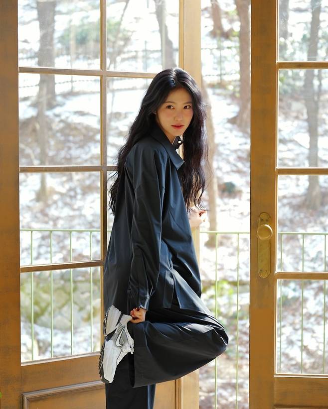 따뜻한 햇살 아래 긴 머리를 살짝 넘긴 신예은이 포근하게 앉아 있다. 블랙 셔츠 드레스를 자연스럽게 흘려 입은 그녀의 눈빛엔 여유가 가득하고,