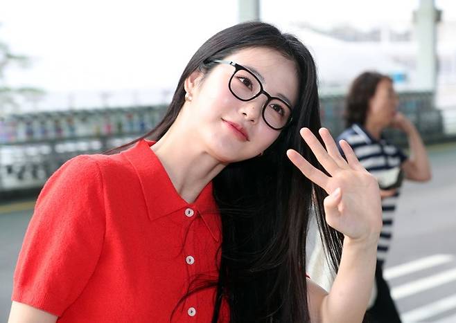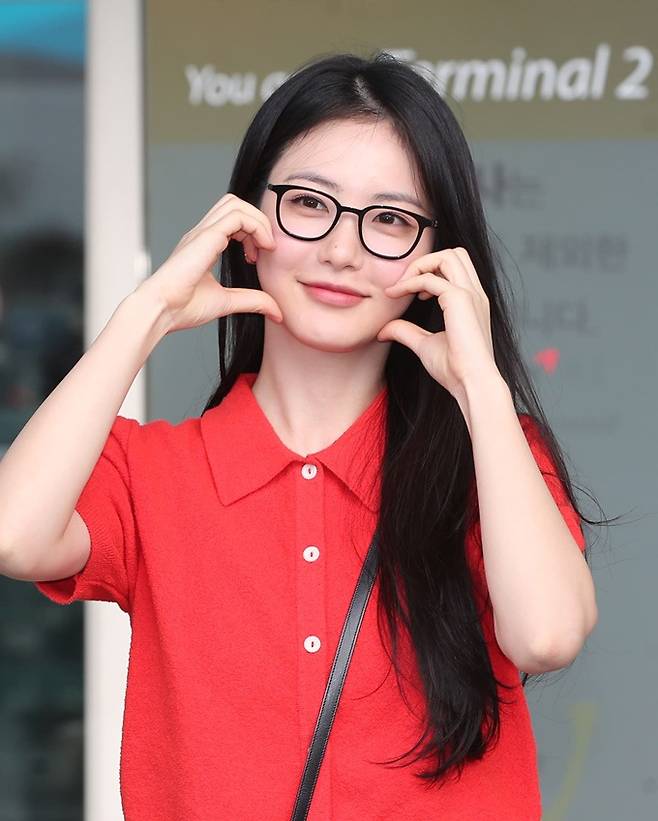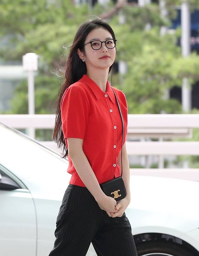 이날 신예은은 레드 카디건과 블랙 팬츠, 여기에 블랙 컬러의 뿔테 안경을 착용, 편안한 무드의 캐주얼한 공항패션으로 눈길을 끌었다.