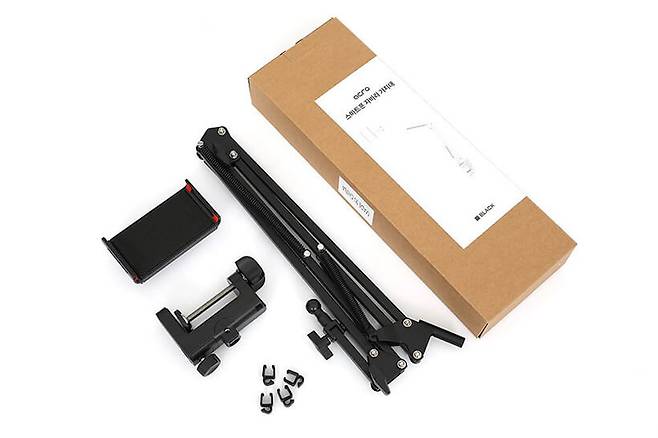 구성품으로는 탄소강으로 된 접이식 브라켓 본체와 브라켓을 고정하기 위한 클램프, 그리고 스마트폰이나 태블릿PC를 장착하기 위한 헤드가 기본 제공되며, 플라스틱으로 된 선정리 클립도 4개가 함께 제공된다. 별도의 사용 설명서는 제공되지 않으며, 박스 뒷면에 설치 방법이 안내되어 있다.