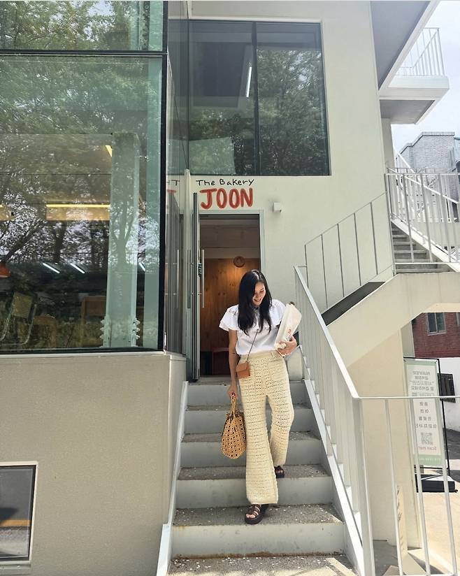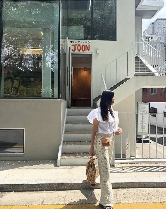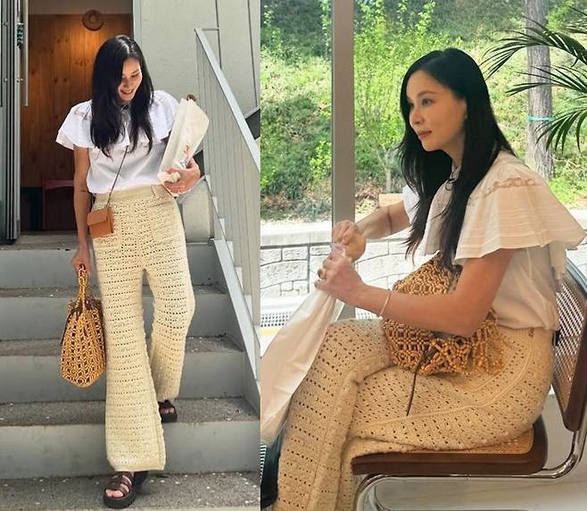 특히 감각적인 소재감이 돋보이는 크로셰 팬츠는 평범한 데일리룩에 품격을 더했습니다.
