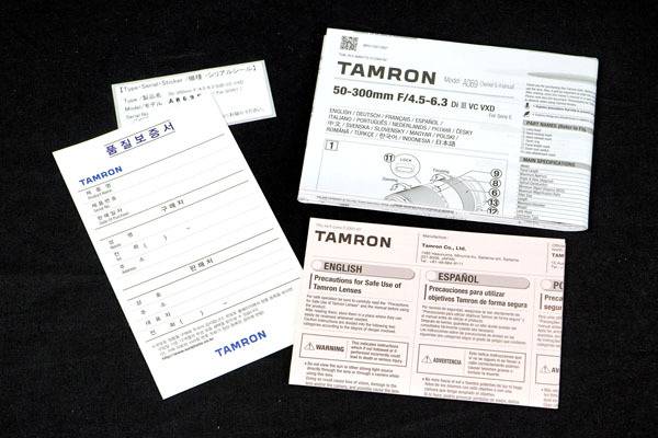그 밖에 다국어 사용자 설명서와 안전 가이드, 시리얼 넘버 스티커, 그리고 탐론 렌즈의 국내 공식 유통사인 썬포토에서 제공하는 품질 보증서가 들어간다. 썬포토에서 유통하는 탐론 렌즈는 박스에 정품 스티커 씰이 붙어 있어 쉽게 구분할 수 있으며 홈페이지에 정품 등록을 하면 구입일로부터 12개월 동안 AS 보증을 받을 수 있다.