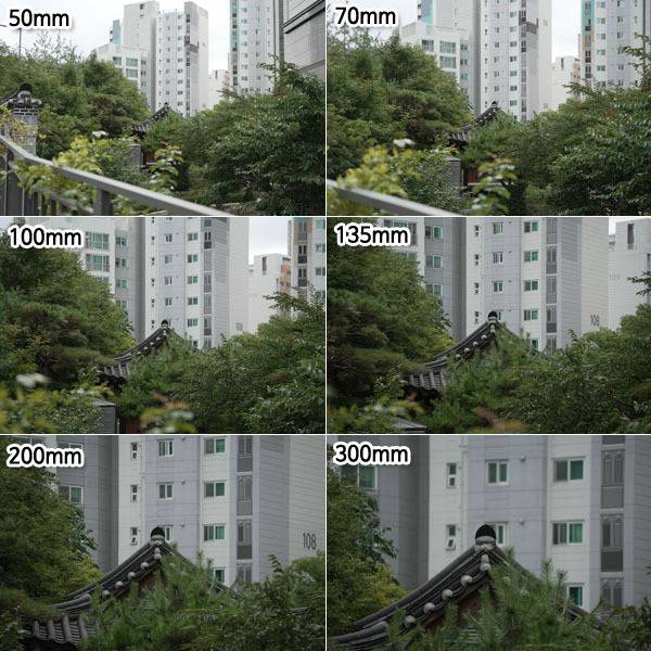렌즈에 표시된 줌 구간별 화각을 비교해보면 망원에서 200mm와 300mm는 큰 차이가 없어 보이지만, 표준-망원 구간에서 50mm와 70mm는 제법 차이가 난다. 50mm 화각이 추가되면서 렌즈를 교체하지 않고도 표준 화각의 더 많은 풍경을 담을 수 있다.