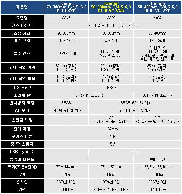 탐론 50-300mm F/4.5-6.3 Di III VC VXD는 이들 두 렌즈의 절충점에 해당하는데, 화각은 50mm 표준 구간부터 시작해 300mmm 망원까지, 무게는 70-300mm보다 겨우 120g 증가한 665g으로 신형 VXD와 손떨림 보정(VC) 기능까지 모두 적용됐다. 가격 또한 예판 기준 109만원대로 두 렌즈 사이에 위치한다.