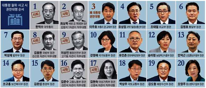 이주호가 탄핵되면 다음은 유상임(과학기술정보통신부 장관)과 조태열(외교부 장관), 김영호(통일부 장관) 순이다.
