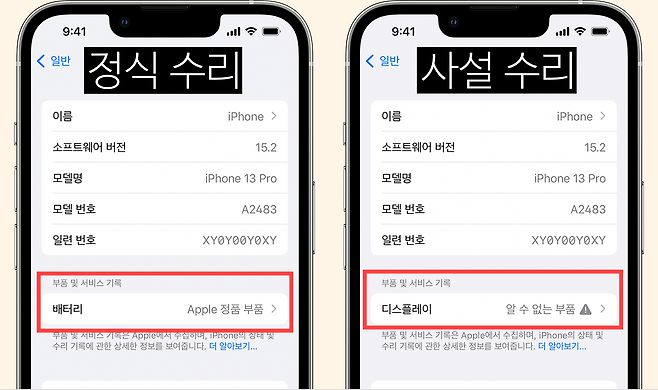 애플은 사설 업체에서 수리 받은 이력이 있는 아이폰의 경우 리퍼 등 공식 수리 서비스를 제공하지 않는다. 이 때문에 구매하려는 아이폰이 사설 수리 이력이 있는지 꼭 확인해야 한다. 만약 부품 교체를 한 아이폰이라면 설정-일반-정보 탭에서 일련번호 밑에 ‘부품 및 서비스 기록’이 나온다.