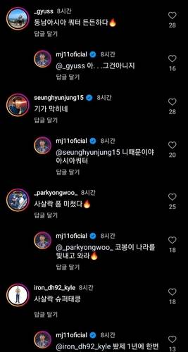 이들은 이명재를 향해 '동남아 쿼터', '사살락 폼 미쳤다' 등의 댓글을 남겼다.