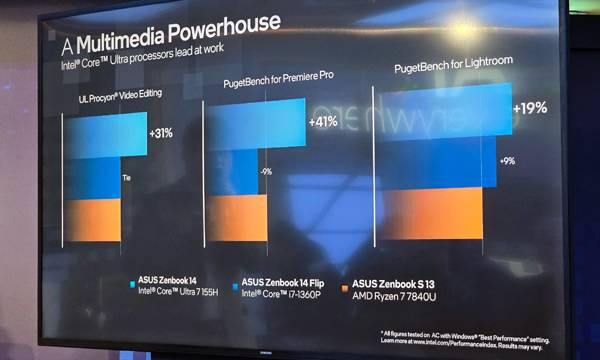 또한 이전 발표회에서는 언급하지 않았던 인텔 코어 울트라의 성능 데이터도 공개했는데, 이전 세대인 13세대 코어 i7 프로세서 및 경쟁사 AMD의 라이젠 7840U 프로세서와 비교하여 CPU 멀티 스레드 성능은 이전 세대 대비 2~8% 정도, 경쟁사 대비 두 자릿수(11%) 성능 격차를 보인다고 밝혔다. 멀티미디어 성능은 인텔 이전 세대와 AMD 제품이 거의 비슷했는데 인텔 코어 울트라 프로세서는 굉장히 큰 성능 격차를 보인다고 한다.