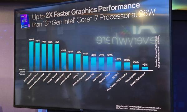 인텔 아크 GPU가 탑재된 내장 그래픽 성능은 이전 세대 대비 최대 2배까지 올라갔다. 물론 최적화가 안된 게임에서는 10% 정도의 성능 향상에 그쳤지만 대부분의 게임에서 40% 정도의 성능 향상을 기대할 수 있다고 한다.
