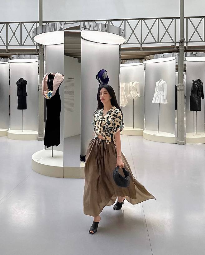 갤러리에서 포착된 모습에서는 레오파드 패턴 상의와 브라운 톤의 플리츠 스커트를 매치해 빈티지한 매력을 발산하고 있다. 미디 길이의 A라인 스커트와 블랙 오픈토 힐이 조화를 이루며 모던하면서도 클래식한 룩을 완성했다.