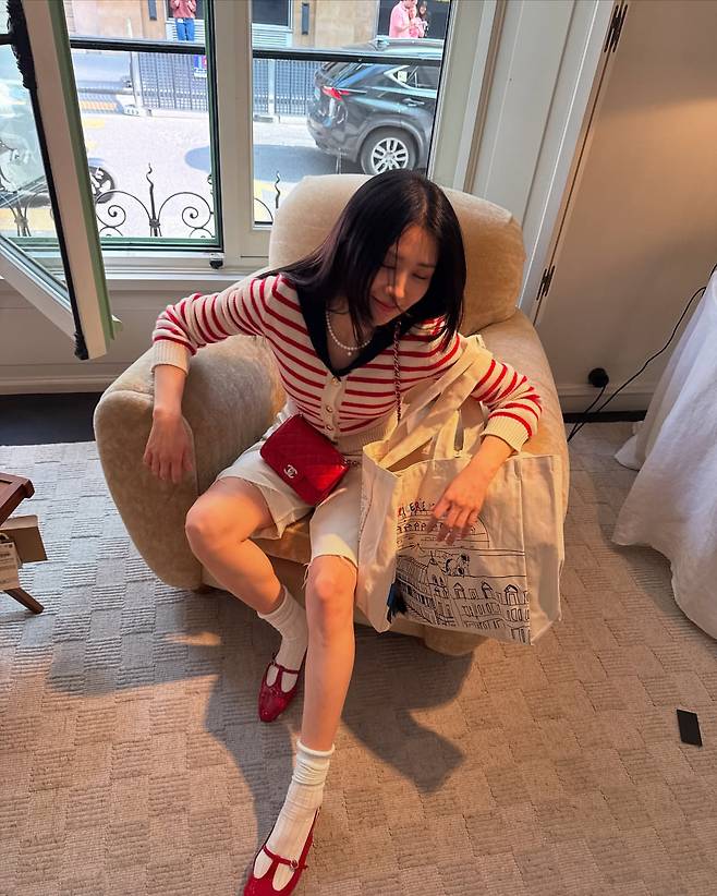편안한 일상 속에서는 레드 스트라이프 가디건과 화이트 팬츠로 산뜻한 캐주얼 스타일을 선보이고 있다. 레드 포인트 슈즈와 체인백으로 포인트를 주어 단조로움을 피하며, 편안하면서도 세련된 데일리 패션을 연출하고 있다.