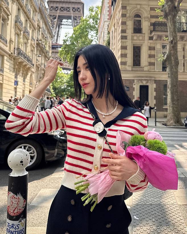파리 거리에서는 같은 스트라이프 가디건을 네이비 스커트와 매치해 프렌치 시크의 정수를 보여주고 있다. 펄 목걸이와 플라워 부케가 로맨틱한 분위기를 더하며, 파리지엔 특유의 우아함을 완벽히 소화하고 있다.