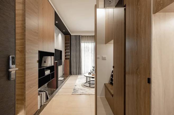신발장과 벤치, 그리고 거울이 자연스럽게 배치되어 출입 경로가 매끄럽다. 상단 조명 대신 숨겨진 조명을 사용하여 편안한 분위기를 조성했다.