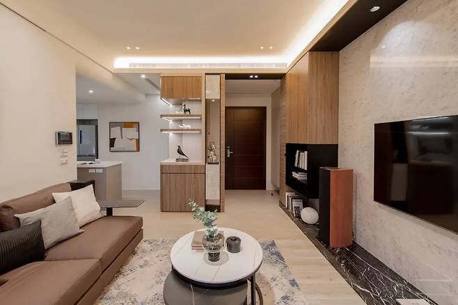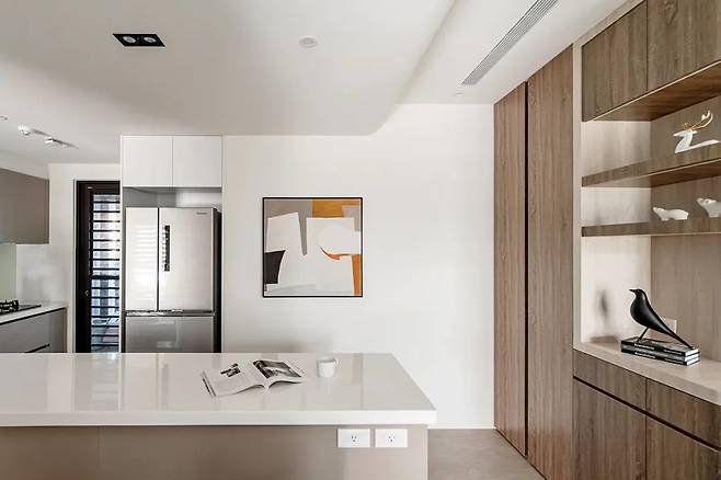 입구의 나무 장식과 이어지는 주방은 동선에 맞춰 수납 공간이 확장되고, 양면 수납장이 실용적으로 배치되어 있다.
