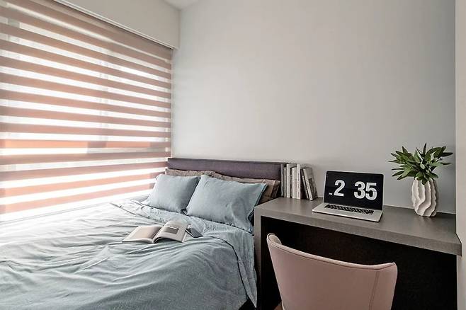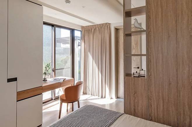 입구 동선에 설치된 분리형 수납장이 침실과의 경계를 정의하며, 자연스러운 분위기 전환을 돕는다. 큰 코너 창으로 들어오는 햇살과 녹음이 데스크 주변을 둘러싸 휴식과 업무가 조화롭게 공존하는 공간을 만든다.