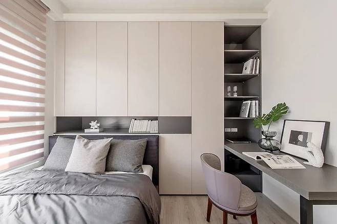창의 위치와 긴 침대 크기에 맞춰 하나의 벽면에 모든 가구를 배치했다. 침대 헤드를 따라 책장과 옷장이 정렬되고, 일부는 개방형 플랫폼처럼 구성되어 다양한 수납 방법을 제공한다.