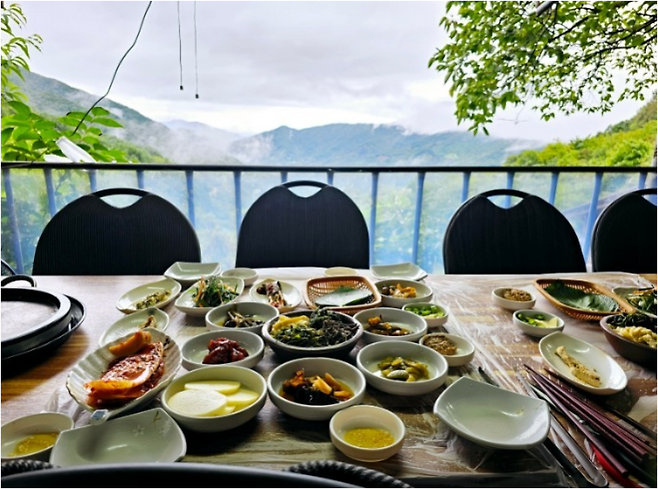 지리산 자락 깊은 곳, 해발 400~500m에 위치한 당치민박산장은 35년째 그 자리를 지키고 있는 따뜻한 부부의 손길이 느껴지는 곳이에요. 직접 키우거나 채취한 재료로 만든 음식은 말 그대로 ‘자연 그대로’ 밥상이에요. 가장 유명한 건 돌판에서 구워낸 ‘산닭구이’. 겉은 바삭하고 속은 촉촉해서 한입 베어물면 진짜 감탄이 나올 정도랍니다. 이 메뉴에는 제철 산나물 반찬 10가지가 곁들여지는데, 그 반찬들이 또 별미예요. 입안 가득 퍼지는 향긋한 봄 내음에 절로 기분이 좋아집니다.