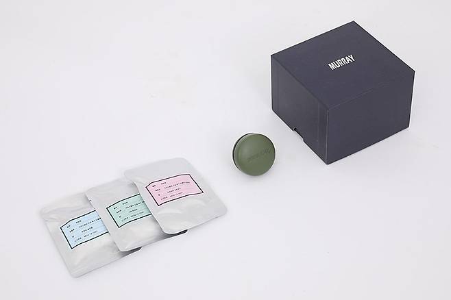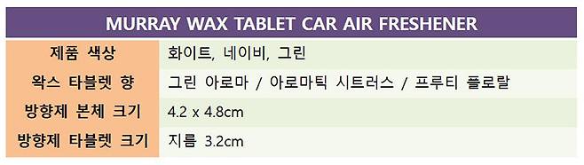 구성품으로는 머레이 크리스탈린 왁스 가죽 차량용 방향제 M-CENT 본품과 세 가지 향의 밀봉된 왁스 태블릿이 제공된다.