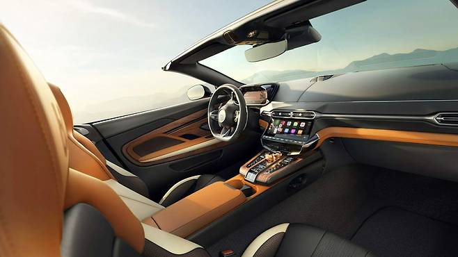 실내는 센테너리 새들 탄과 아이보리 컬러의 우븐 가죽, 다크 월넛 우드와 브론즈 디테일이 섬세하게 어우러져, 탑승자에게 절제된 감동을 선사한다.