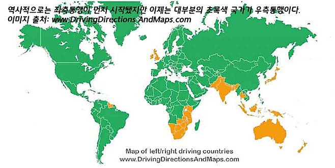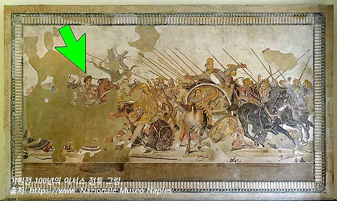 이 주장의 근거가 되는 좌측 탑승 및 우측 교차 통행의 승마 관행을 뒷받침하는 근거는 고대 유물에서 다양하게 볼 수 있는데, 그중 하나가 기원전 100년경에 그려진 알렉산더 대왕(King Alexander)이 페르시아의 다리우스 왕(Persian King Darius)과 치룬 전쟁 중 하나인 「이서스 전투(Battle of Issus)」 장면의 그림에서 볼 수 있다. 여기에서는 양측 진영의 병사와 마필이 도로의 왼쪽으로 교행(交行)하면서 전투하는 모습을 볼 수 있다.