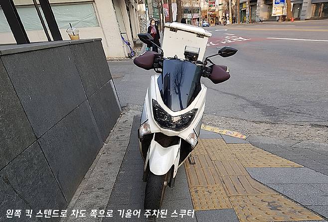 대부분의 2륜차는 잠깐의 주차 시에는 킥 스탠드를 사용한다. 이때 차체는 차량 전진 방향을 기준으로 좌측으로 기울어진 상태가 되는데, 이에 따라 우측통행 방식을 가진 우리의 교통 환경에서는 2륜차 차체가 차도 방향으로 기울어진다. 그리고 만약 차로 쪽으로 배수 기울기가 만들어져 있는 보도 위에 2륜차를 주차하면 차체가 도로 쪽으로 더욱 크게 기울게 되어 불안정성이 커질 수도 있다.