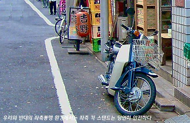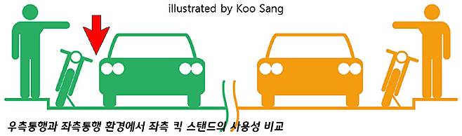 반면에 우리나라와 반대로 좌측통행을 하는 인도(India)나 일본의 교통환경에서는 좌측 킥 스탠드의 사용이 도로의 차량 통행이나 보행에서 상대적으로 안전성을 확보할 수 있는 조건이 만들어지는 걸 볼 수 있다. 또한, 2륜차 탑승에서도 차도로 나가지 않은 채 탈 수 있다.