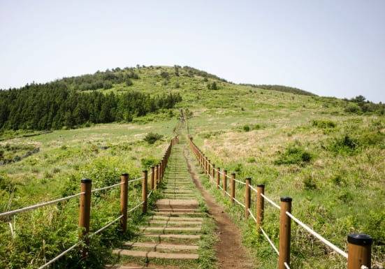 오래 걷는 것을 힘들어하는 부모님과 함께하는 제주도 여행이어도 걱정이 없습니다. 정상까지 오르지 않아도, 입구 인근 길게 뻗은 계단 앞에서 싱그러움 가득한 풍경을 감상할 수 있기 때문이죠. 관광객이 많지 않다면 이 계단에 잠시 앉아 불어오는 바람에 잔디들이 춤을 추는 소리를 감상하기에도 좋습니다.
