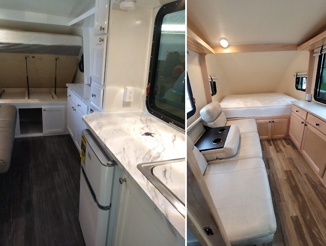 실내는 작은 공간임에도 불구하고 효율적인 구성을 갖췄다. 기본적으로 전면에는 고정형 침대가 설치돼 있고, 중앙에는 접이식 3단 소파와 거실 공간이 마련돼 있다. 주방에는 넉넉한 조리대와 싱크대가 포함되며, 간이 오븐과 수납장도 구비된다. 습식 욕실로 변기, 샤워기, 세면대가 통합돼 있다.