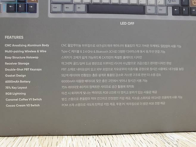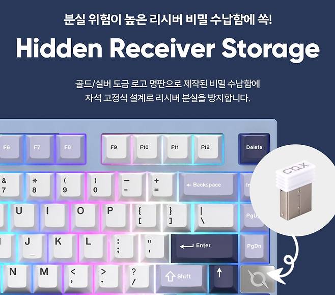 키보드 상판에 있는 비밀 수납함에 리시버가 보관되어 있고, 다양하고 화려한 RGB LED 백라이