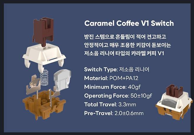 콕스에서 새로 나온 카라멜 커피 스위치로 저소음(키압 50g)에 부드러운 타건감을 제공합니다.