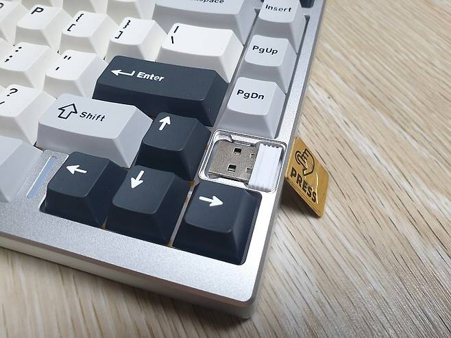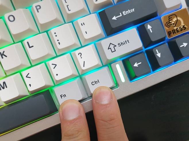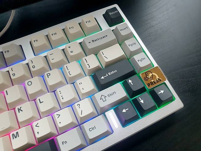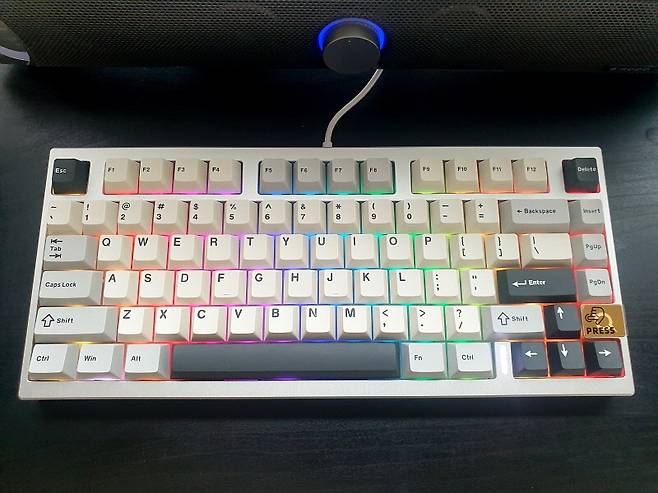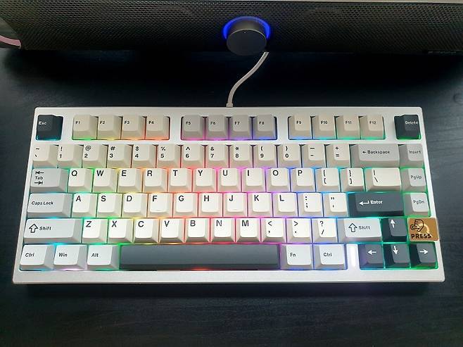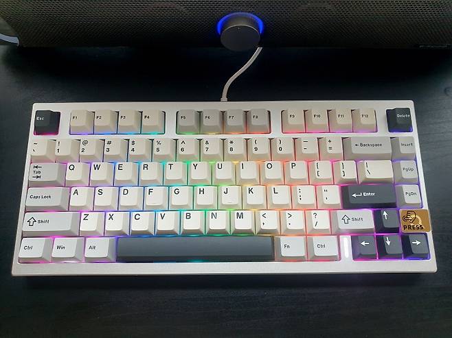 투과 키캡이 아니라서 화려함보다는 차분한 느낌입니다. 방향키 옆에는 상태 표시 LED 입니다.