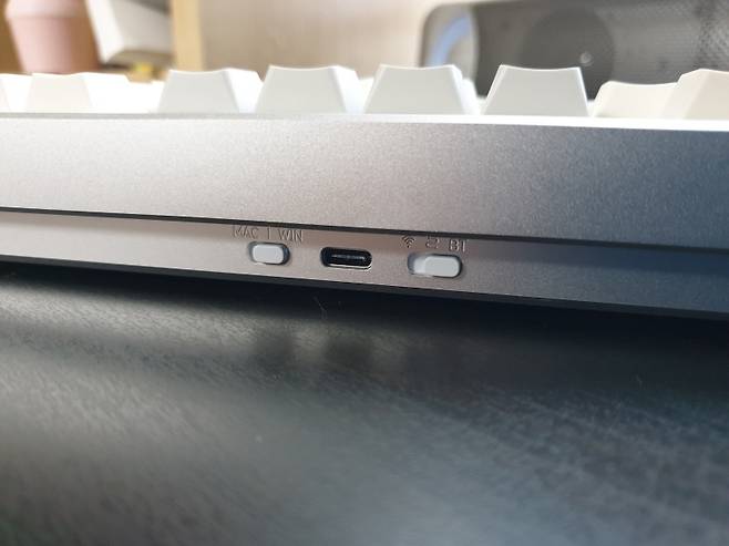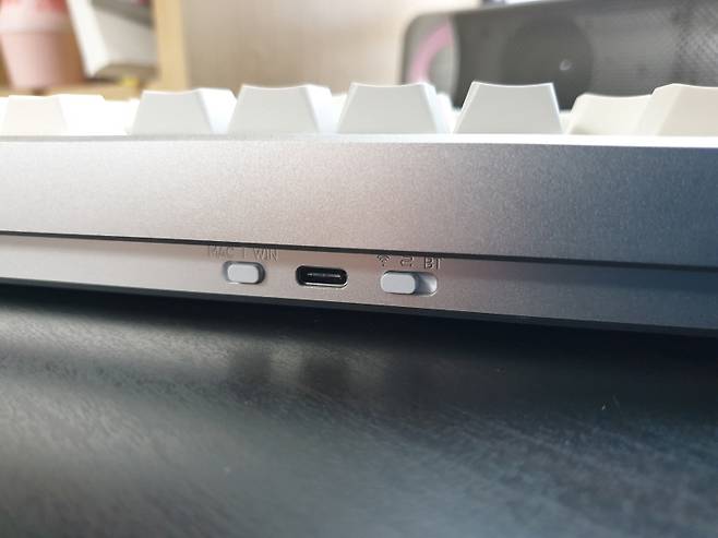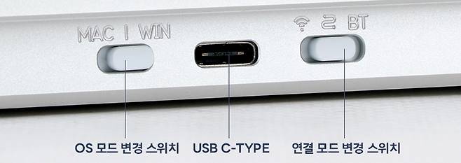 MAC/WIN 모드 변경 스위치, C 타입 전원 포트, 3모드(무선, 유선, 블루투스) 변경 스위치입니다.