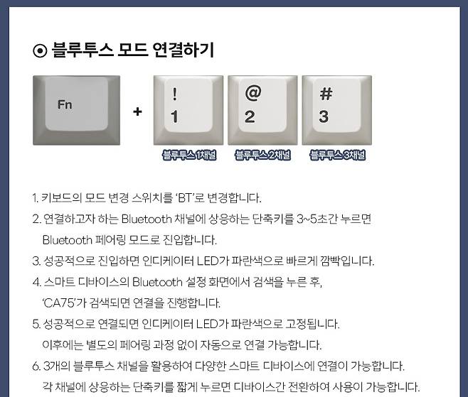 블루투스 연결은 BT 변경 스위치로 맞춰 놓고, FN+1, 2, 3 단축키를 통해 3개의 디바이스에 연결