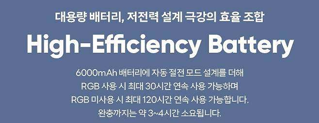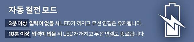 다. 대용량 6000mAh 배터리 내장에 자동 절전 설계로 최대 120시간 연속(LED OFF) 및 최대 3