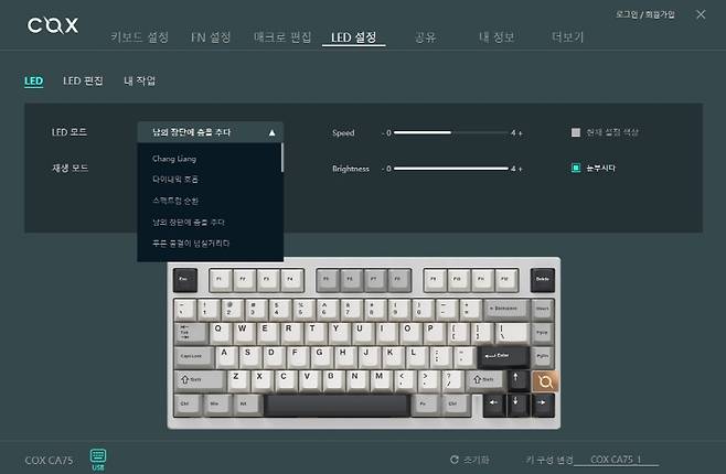 LED 설정 메뉴입니다. LED 모드, 속도, 밝기 조절도 가능합니다.